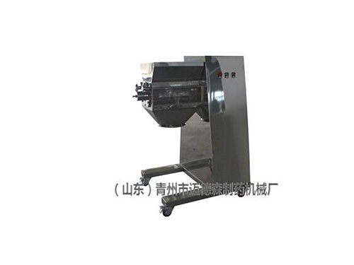 开动机器,将混合料倒入斗内,由旋转滚筒的摇摆作用,压挤物料过筛网形成颗粒,如粉